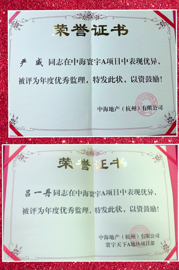 杭州信達監理團隊多人獲得建設單位表揚,其中李朝良表現優異,獲年度優秀總監;許令秀獲年度優秀總監代表;嚴威、呂一丹獲年度優秀監理等獎項。