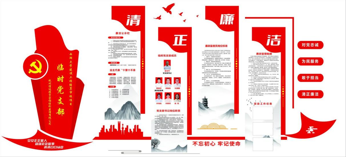臨時黨支部由金雷杰擔任黨支部書記,程建忠擔任廉政監督員,并納入俞敏良、沈愛國、許海良、徐振邦、趙悅5名優秀黨員,同時制定了崗位職責、工作標準、廉政管理等制度,并提出清正廉潔、不忘初心、牢記使命,激發全體黨員工作活力,把黨旗深深地插在項目部上的工作方針。